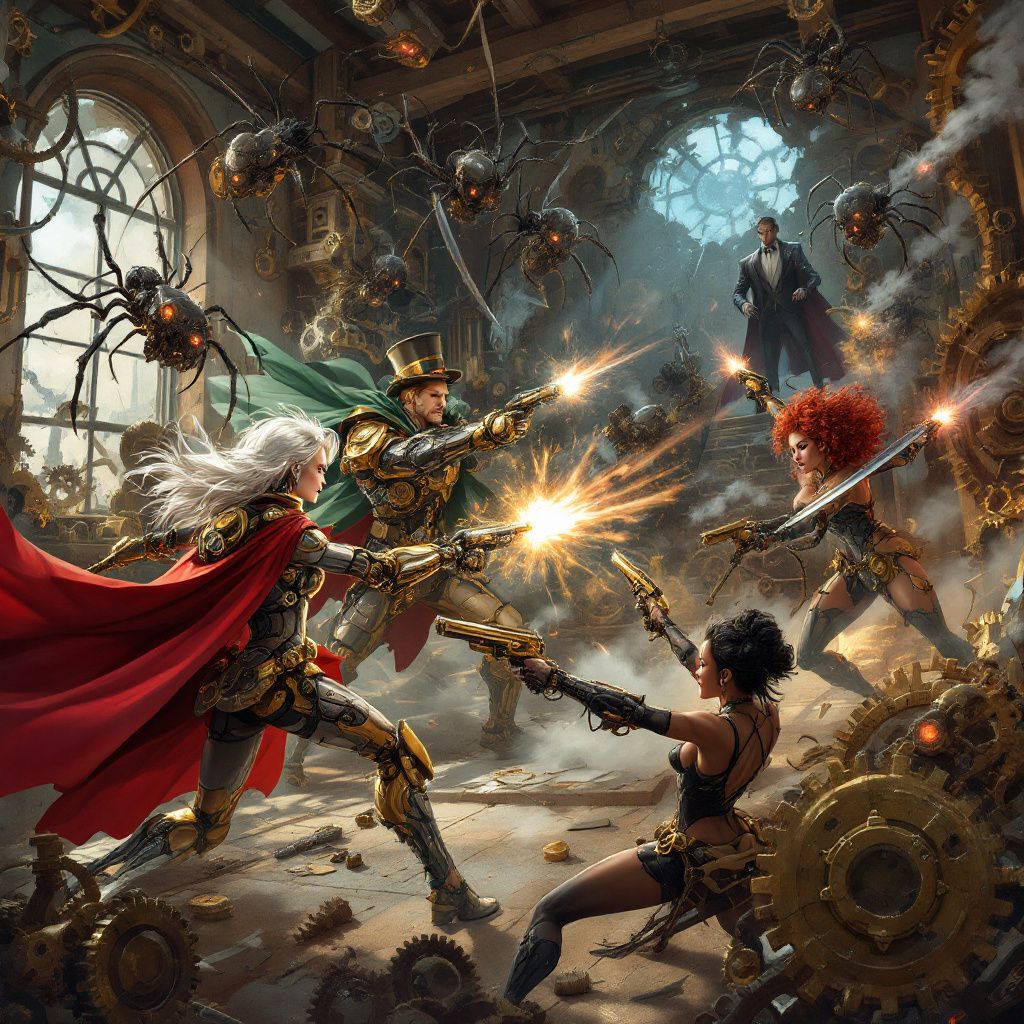 The battle was fierce and chaotic. Magnus used his brute strength and mechanical enhancements to smash through the spider-like automatons, while Nova’s disruptor sent bursts of electromagnetic pulses that disabled their circuits. Celeste moved with graceful precision, her pistols firing round after round, while Akari danced through the chaos, her katana slicing through metal legs and gears with ease.